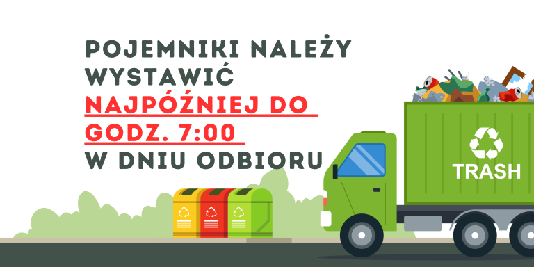 W związku z pojawiającą się zwiększoną liczbą zgłoszeń dotyczących odbioru odpadów komunalnych, Urząd Gminy Wierzchosławice przypomina mieszkańcom o obowiązku wystawiania pojemników (koszy) na odpady najpóźniej do godziny 7:00 w dniu