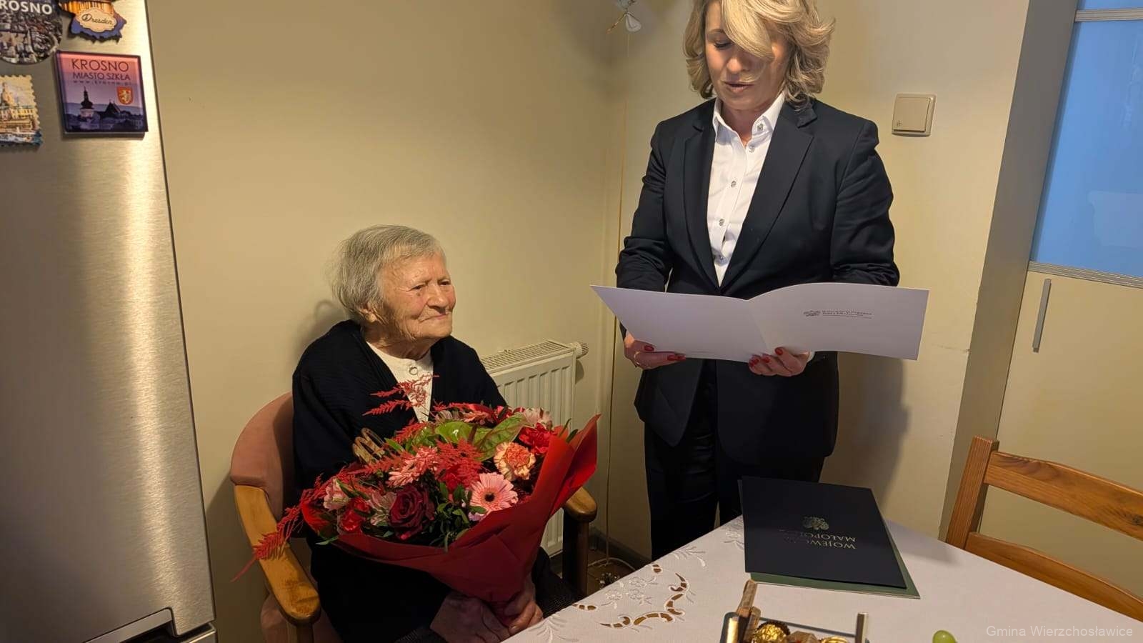Z okazji 100. rocznicy urodzin Zakład Ubezpieczeń Społecznych przekazał Pani Tekli specjalne świadczenie, które wręczyła Anna Harbuz – zastępca dyrektora ZUS Oddział Tarnów.