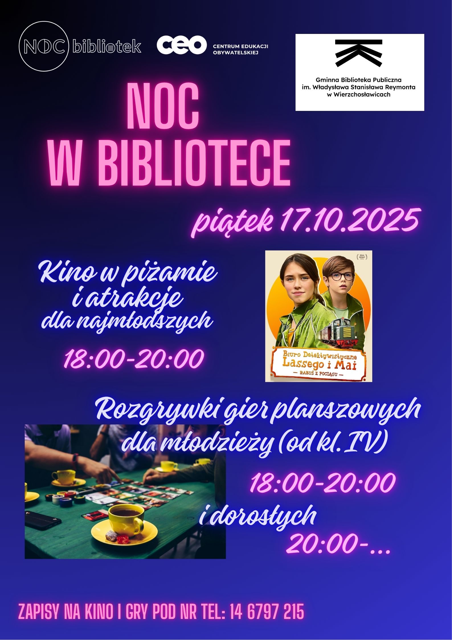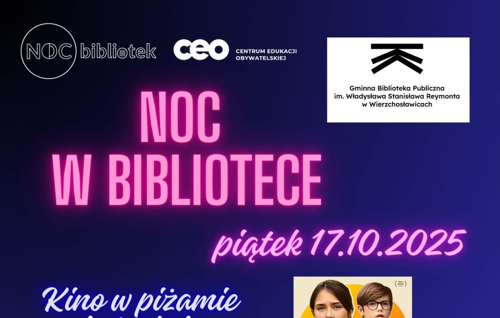 18:00-20:00 – atrakcje dla najmłodszych: fotobudka, poczęstunek, zabawy integracyjne, a na koniec w piżamach, na kocach i poduszkach film w bibliotecznym kinie – „Biuro Detektywistyczne Lassego i Mai. Rabuś z pociągu”.