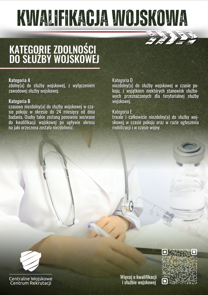 do czynnej służby, B – czasowo niezdolny, D – niezdolny w czasie pokoju z wyjątkiem niektórych stanowisk przeznaczonych dla wojsk obron terytorialnej, E – trwale niezdolny.